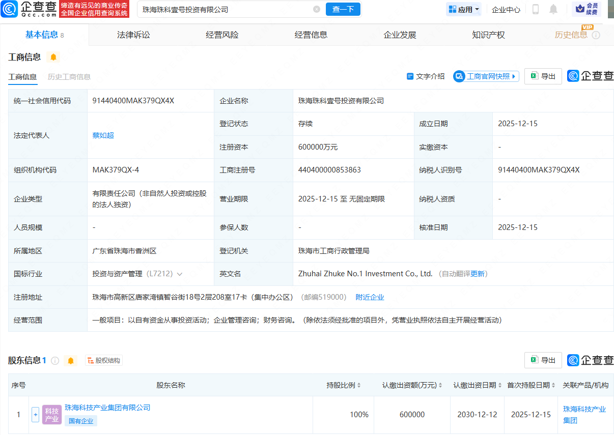 近日,珠海珠科壹号投资有限公司成立,法定代表人为蔡如超,注册资本60亿元,经营范围包含:以自有资金从事投资活动;企业管理咨询;财务咨询。企查查股权穿透显示,该公司由珠海科技产业集团有限公司全资持股。